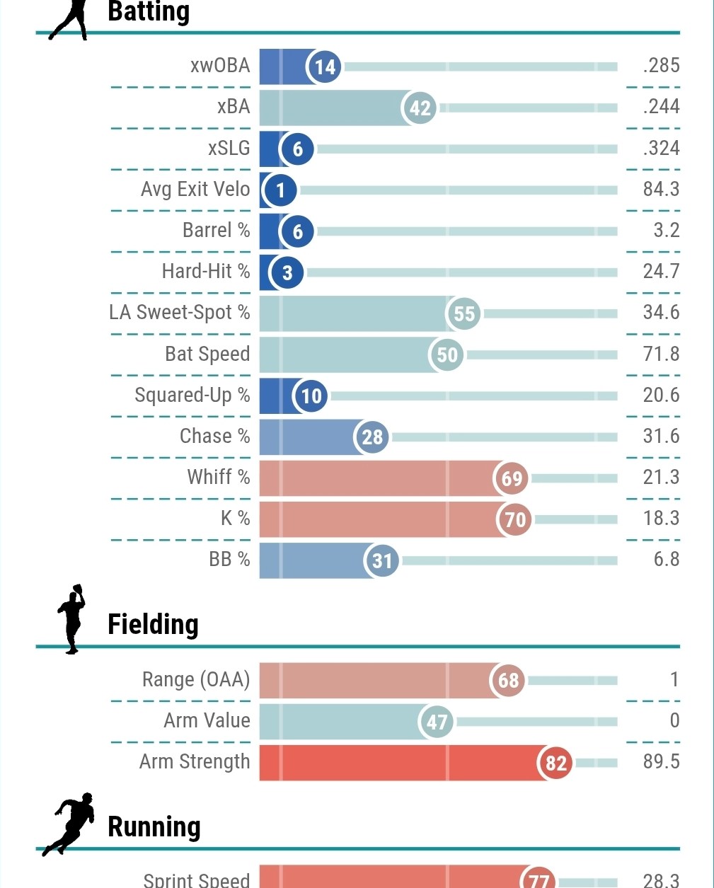 His overall career line currently sits at .248/.333/.402 making him basically the most major-league averagest hitter. He hits for a decent average, takes a few walks, and knocks a few out of the park. Even better, he steals bases pretty frequently, nabbing more than 20 stolen bases in both 2023 and 2024. And the lefty can variously play each outfield position. He’d even managed to run an xwOBA overperformance for three straight seasons, though the extent to which this was due to him slapping the ball past fielders or just luck is unclear. This is basically what you’re getting …
