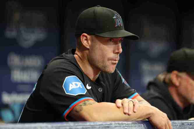 Jul 30, 2024; St. Petersburg, Florida, USA; Miami Marlins manager Skip Schumaker (45) looks on against the Tampa Bay Rays during the first inning at Tropicana Field. Mandatory Credit: Kim Klement Neitzel-USA TODAY Sports