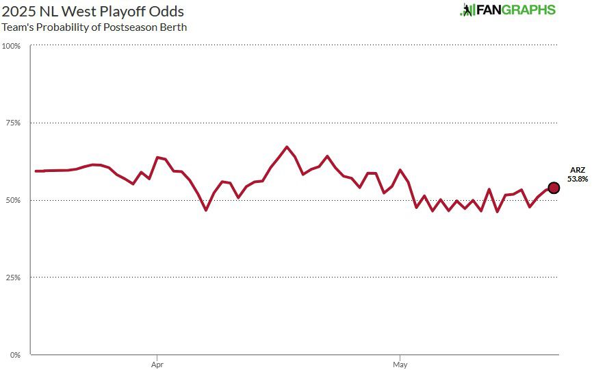 It has certainly been an emotional roller-coaster for Diamondbacks fans this season. It feels like every tragedy, where it feels the season is going down the plughole, is followed by a surge of positive results. Well, until the next tragedy, anyway. But what’s interesting is how little an impact any of this has had on the team’s overall post-season chances. Below, is the graph of Arizona’s playoff odds from Fangraphs. Of course, there have been ups and downs. But the odds have remained close to the 59.2% at which they started the season: they have only briefly been outside of ten percent, plus or minus, from that figure. Right now, they sit at 53.8%, the best they have been since May 2nd.