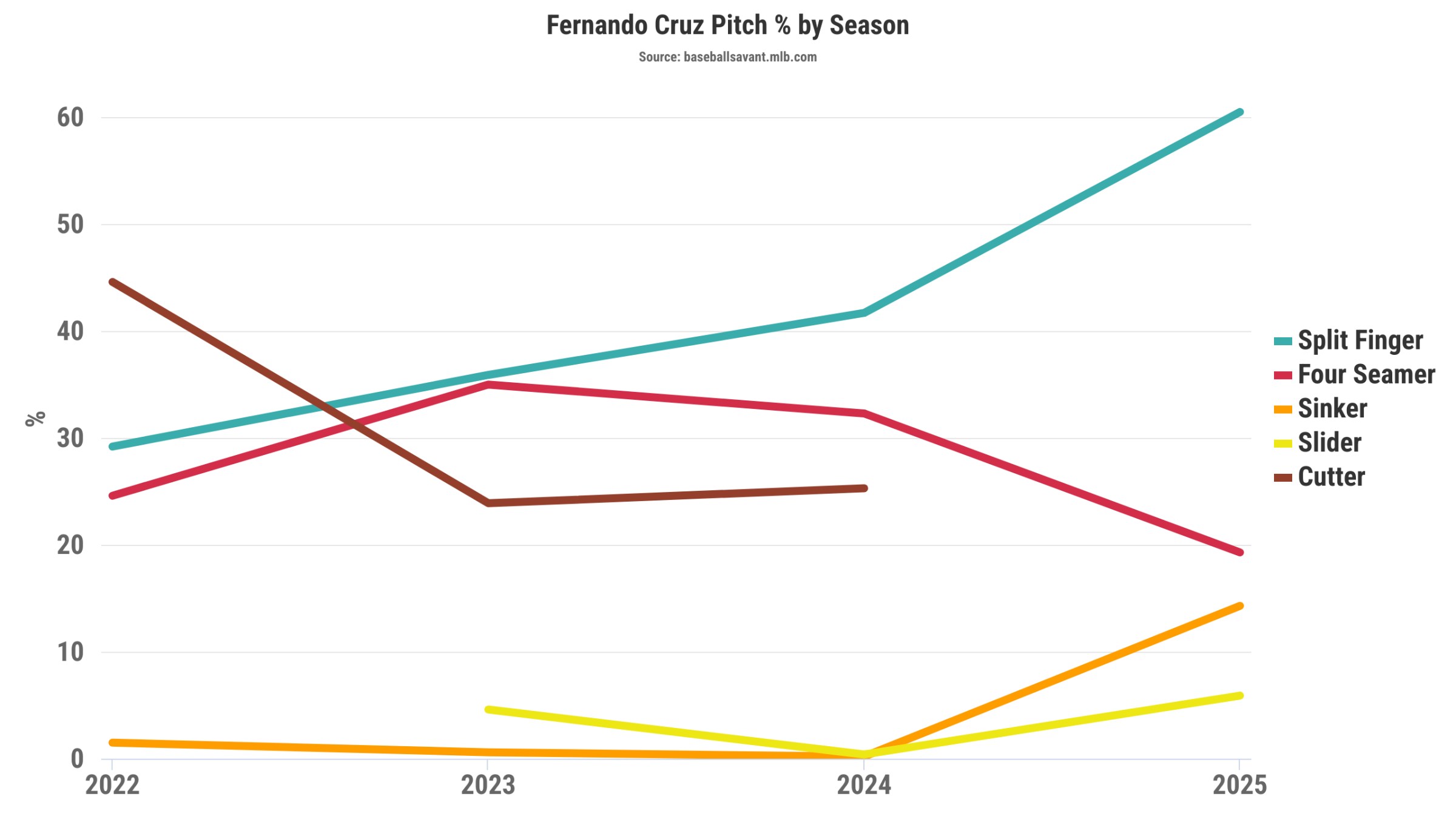 The Yankees looked at Cruz’s numbers, and one of the first things they had him do was—quite simply—throw his splitter more often, much more often.