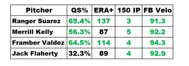 Between August and the end of the season, the percentage of quality starts fell for all four pitchers. The lead changed from Framber Valdez (64.5% QS) to Ranger Suarez (65.4%).
