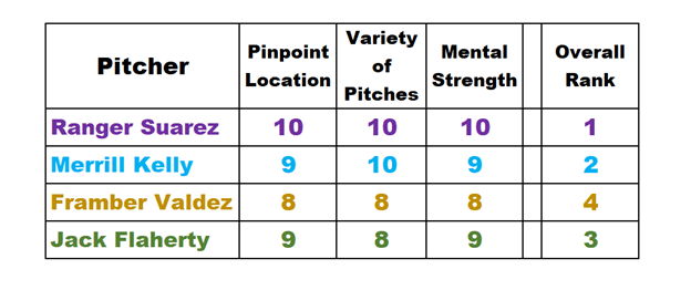 Ranger Suarez ranked first on the three evaluation factors (command, variety of pitches, and mental strength). In addition, he led in percentage of quality starts and ERA+.