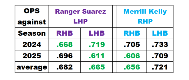Concern: He is a left-handed pitcher (and will naturally have an advantage against left handed batters). The concern is how will he do against right-handed batters? The following table compares his splits to Merrill Kelly’s splits. Looking at a simple average of the last two seasons, against right-handed batters, Merrill Kelly has a slight edge (.656 vs .682 OPS against) and against left-handed batters, Ranger Suarez has a big edge (.665 vs .721 OPS against). Overall, Ranger Suarez’s split is not big enough to override the other evaluation factors.