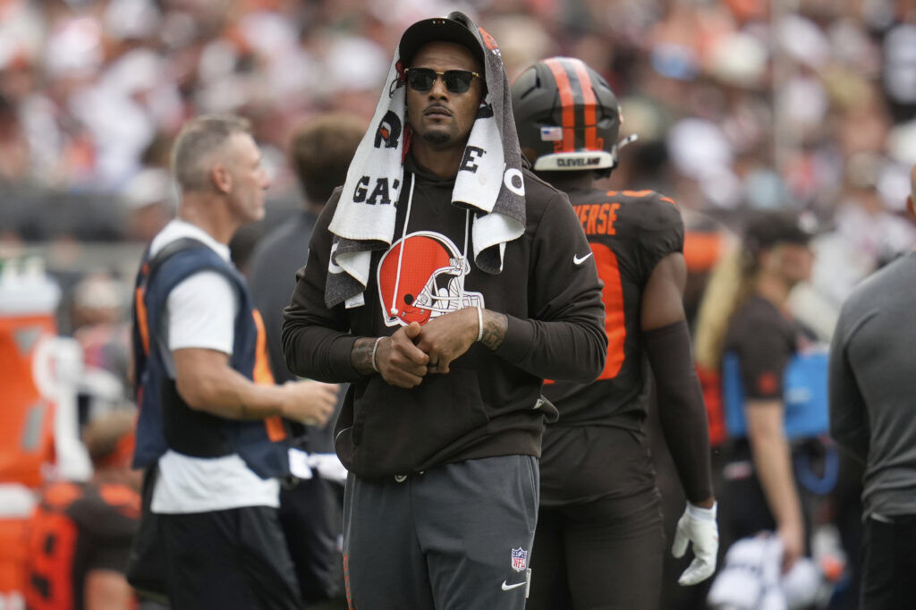 Injured Cleveland Browns quarterback Deshaun Watson is pictured on the sidelines during an NFL game against the Green Bay Packers in Cleveland, Sept. 21. (The Associated Press)
