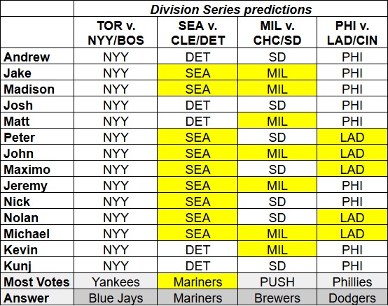 We all had the Yankees moving on here too, and we were sadly mistaken. They provided one scintillating win and a memory for the ages, but ultimately got outplayed by the Blue Jays in four games. We mostly were on Seattle to make it to the ALCS, but we were split on whether the Brewers would get there, and most instructively in my opinion, most of us didn’t have the Dodgers advancing. The narrative around the Dodgers at this point is one of an invincible team breaking baseball, so I think it’s worth remembering that as recently as six weeks ago, it was very much in doubt whether they’d even reach the NLCS.