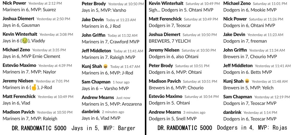 The only one of us to get either of the LCS predictions exactly right was… Dr. Randomatic 5000, who called a Dodgers sweep. We were on the whole pretty split about who would emerge from the ALCS, while the group favored Los Angeles once we knew the MIL vs. LAD matchup.