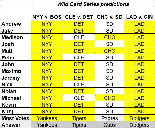 To determine our winner, we’ll award one point for correct Wild Card Series picks, two for the Division Series, three for the Championship Series, and five for the World Series. If you got a Series MVP correctly, you got an extra two points each. There are some second-chance predictions in here, so if you got a CS or World Series pick correct on the first try, you received an additional point for difficulty (and two extra for the Fall Classic because it was so far out at the end of September).