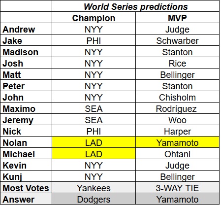 Nolan and Michael split first prize, as the only two to forecast the Dodgers winning before the postseason started. Thanks to all who played along: how did your predictions for the 2025 playoffs turn out?