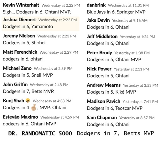 These are our World Series predictions pre-playoffs, with Michael forecasting the Dodgers’ win, and Nolan doing a nice job here in somehow calling both an LA title and a Yoshinobu Yamamoto World Series MVP. Again, I think it’s worth noting that for all the Dodgers’ inevitability, nothing about their march to this title was actually inevitable. They needed a few minor miracles to best the Blue Jays, and before October started, few of us actually picked them to win. And it’s not just us; you can check out FanGraphs’ playoff predictions, for example, where the Dodgers received just one vote to win the World Series before the postseason started.