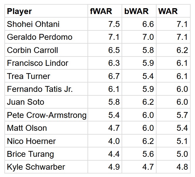 There are arguments over whether to use bWAR or fWAR. So, even though Perdomo’s superiority is clear by both, let’s average out the two measures. There were a total of twelve players who appeared in the top ten by one or other metric. Here are how they stack up in each WAR measure, ranked by the average of the two systems.