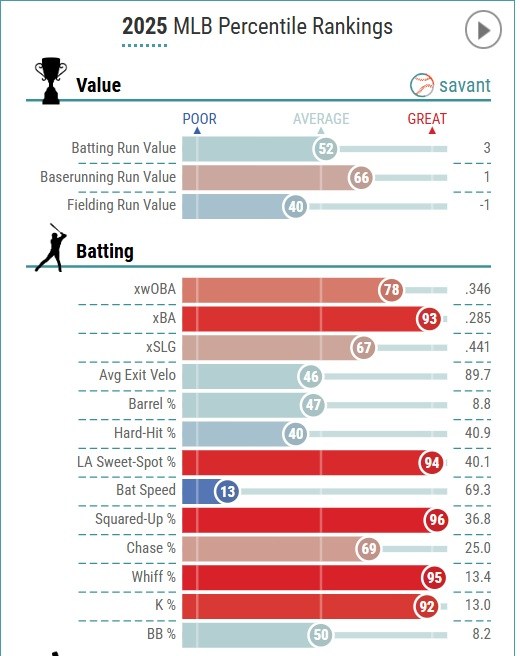 Donovan is a high-contact hitter with the 12th-best contact rate since 2022, and he is 15th among all hitters for the lowest strikeout rate since 2022 at 13.5 percent. He does struggle against lefties, batting .230/.292/.322 against them this year, although he has a career .325 on-base percentage against southpaws.