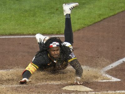 Teammate Oneil Cruz scores from second on a single by Bryan Reynolds during the sixth inning.