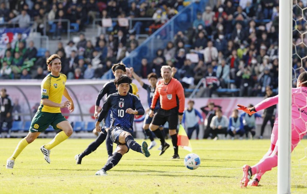 Takuya Okada scored four goals in Japan’s 8-0 rout of Australia in a Group A match in the men’s football competition on Friday, November 14 at J-Village in Naraha, Fukushima Prefecture.