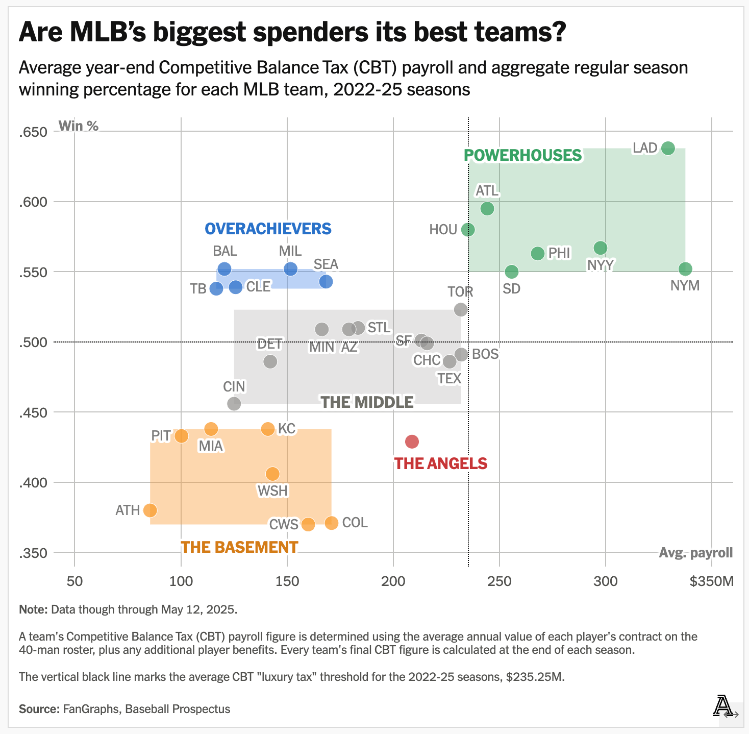 It may be unfair to single out the Angels. But, well, look at the plot. The franchise stands alone. No team in recent memory has spent more and achieved less. The team’s last postseason appearance came in 2014. The club wasted the prime of Mike Trout and let Ohtani depart in free agency. And its own expenditures have proved disastrous: Anthony Rendon has 3.9 wins above replacement, according to Baseball-Reference, during the first five seasons of his seven-year, $245 million deal, and he may not take another at-bat for the club.
