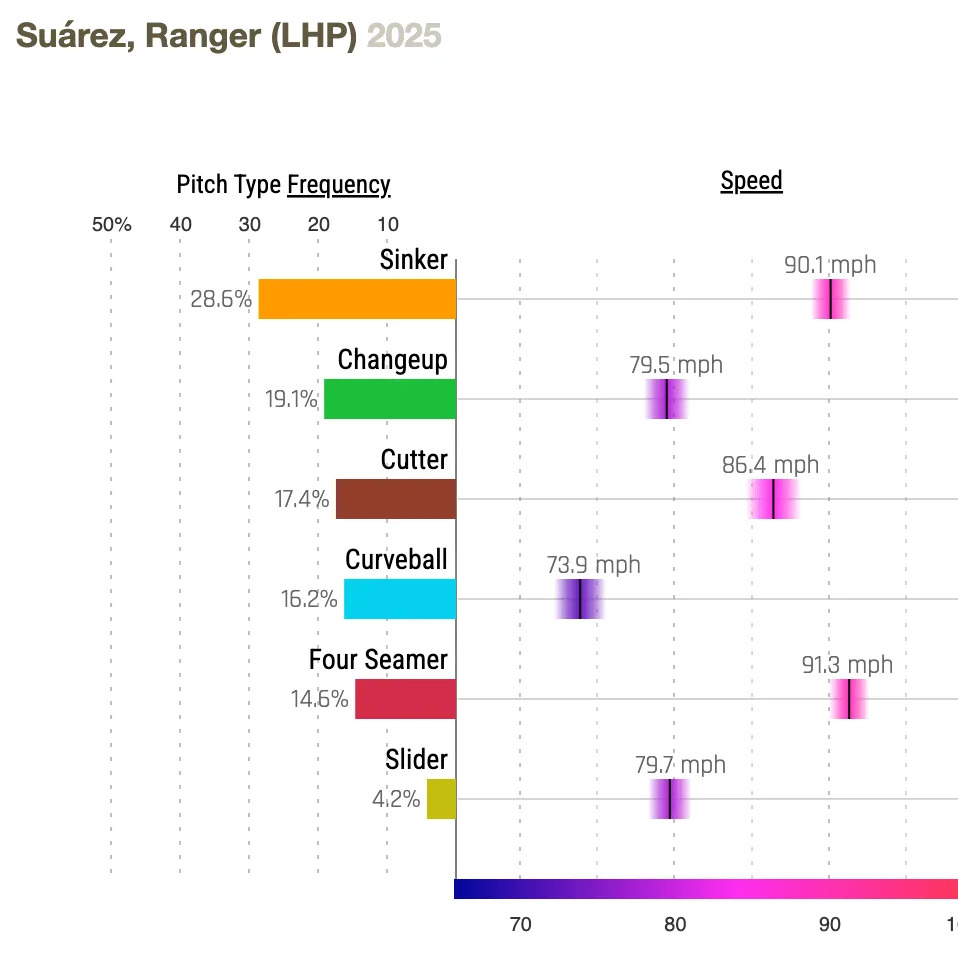 Like a lot of the current Cubs staff, Suárez doesn’t throw that hard, instead getting by with a good selection of offspeed pitches: