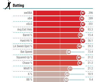 In case you haven’t heard by now, I’m all-in on Ben Rice heading into 2026. As a Red Sox fan, it pains me that I’m this high on Rice, but it’s certainly warranted. In 530 plate appearances with the Yankees last season, Rice slashed .255/.337/.499 with 74 runs, 26 home runs, 65 RBI, and three steals. While good, that slash line doesn’t exactly stand out. But when you look as his underlying metrics, you’ll be blinded with plenty of red on his Savant page.
