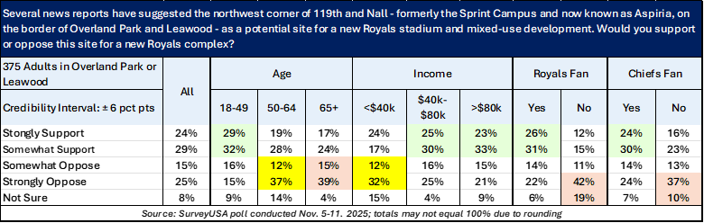 Asked specifically about locating the Royals stadium at the Aspiria Complex at 119th and Nall, 53% would support the move, and 40% are opposed.