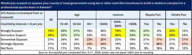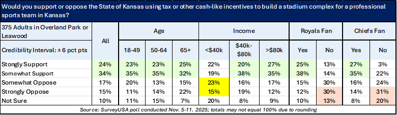 While those surveyed prefer the Chiefs stay in Missouri, they are OK with the State of Kansas offering tax subsidies to build professional sports complexes by a margin of 58% to 32%, with 10% uncertain.