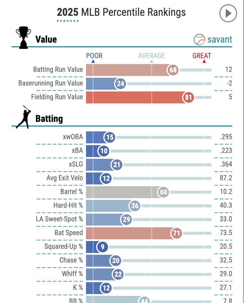 Whenever expected stats are brought up, there’s a very reasonable question that emerges: why should we care about what hypothetically should have happened over what actually did? And the answer is this: the expected stats may tell us more about what’s likely to happen going forward. Bader’s performance in 2025 was excellent, but you can only outplay the peripherals for so long. He is not likely to have such a good batting average on balls in play in 2026. The Bader we see in 2026 is not likely to look like the Bader we saw post-deadline in 2025. He is likely to look more like the Bader that the xStats point to.