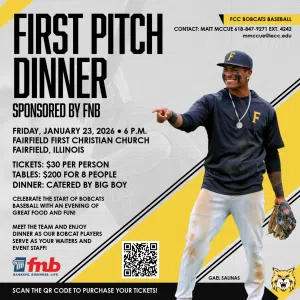 Frontier Community College will host its second annual Bobcats Baseball First Pitch Dinner, sponsored by FNB, on Friday, January 23rd at 6 p.m. at the Fairfield First Christian Church.