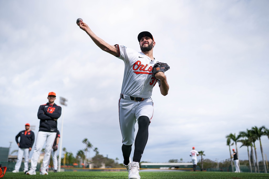 Orioles pitcher Grayson Rodriguez warms up ahead of a bullpen session during spring training. (Ulysses Muñoz/The Baltimore Banner)