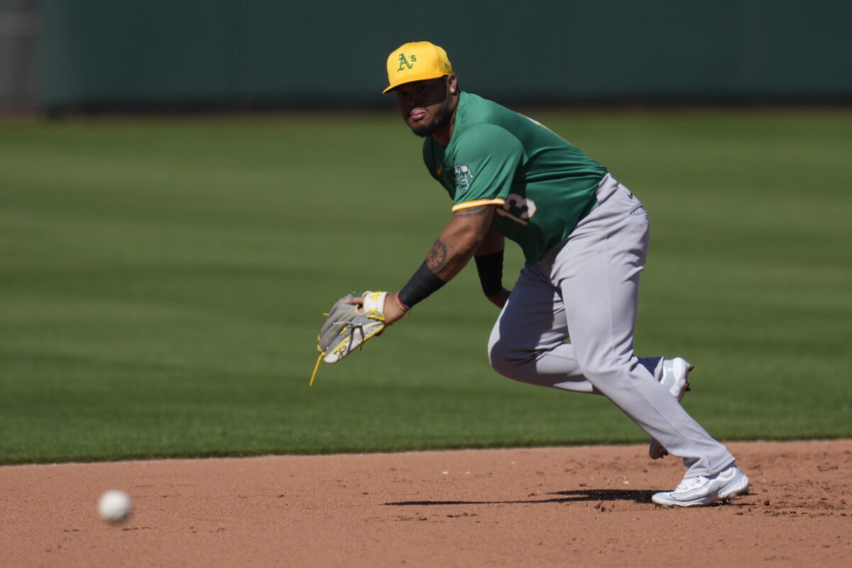 Photo: Oakland Athletics third baseman Jordan Diaz chases down a grounder during the fifth inning of a spring training baseball game against the San Francisco Giants Saturday, March 9, 2024, in Scottsdale, Ariz. (AP Photo/Ross D. Franklin)