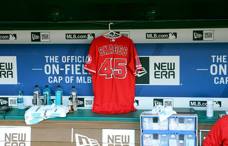 Skaggs’ jersey hangs in the dugout on July, 2019, the day after his death.