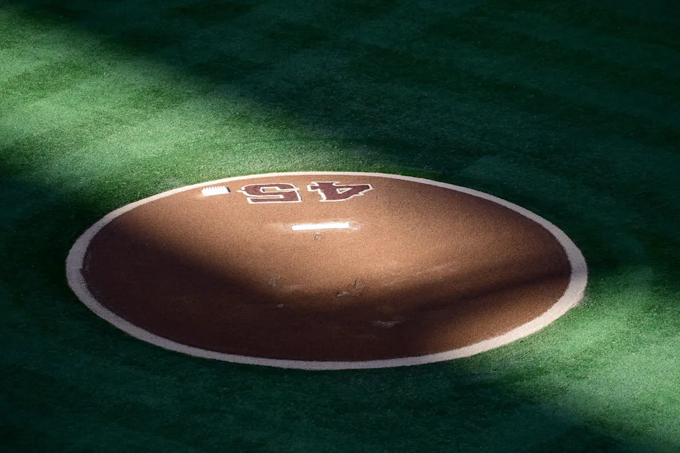 Sunlight illuminates the pitchers mound with the jersey number of late Los Angeles Angels pitcher Tyler Skaggs before a game against the Houston Astros at Angel Stadium of Anaheim on July 18, 2019.