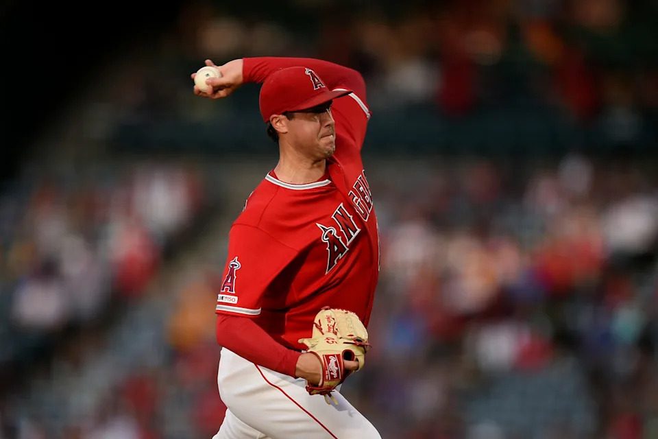 Skaggs pitching against the Blue Jays in May 2019.