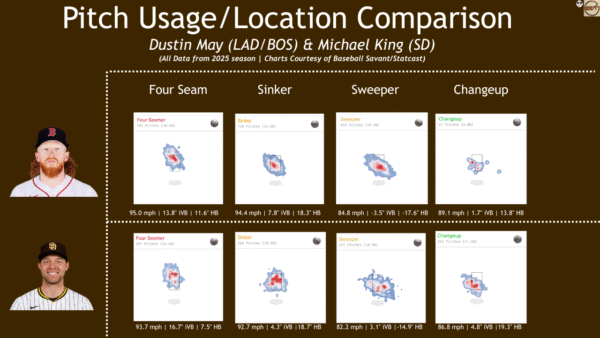 May has a comparable arm angle to Michael King, and King used his fastball and sinker mostly up in the zone in his two seasons in San Diego. Using the fastball up allowed him to set up the sweeper and changeup low in the zone, using the horizontal movement on both for whiffs or weak contact. This worked for King in 2024, as he crossed the 200 strikeout mark and finished seventh in Cy Young voting. May’s velocity now is comparable, if not slightly higher than King’s, so there is a chance that the Padres organization sees the stuff as something they can help the right-hander re-harness.