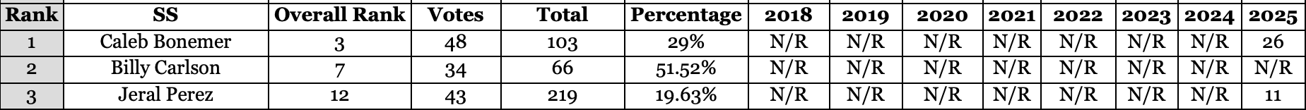 Here is how 2018 wrangled out — all 42 picks. Also, here is an archive of every article in the 2018 series.Here is how 2019 came together, all 50 picks, and the archive as well.Now 2020, with the archive.Here is the 2021 wrap-up of just 35 picks due to flagging participation, along with the full archive.Here is the 2022 link to the 27-pick wrap, along with the full archive.Round 24 of voting was the last of 2023 (we did not do an actual wrap for the voting, but Jordan Sprinkle ended up being our final pick), and the full archive.In 2024 Abraham Núñez was our 34th pick to end the series, and here is the wrap-up post and full archive of each profile.And last year, we did 31 picks, ending with Eric Adler. Here is the wrap and full stream, of every article.