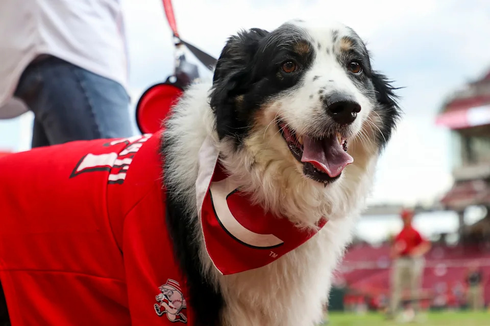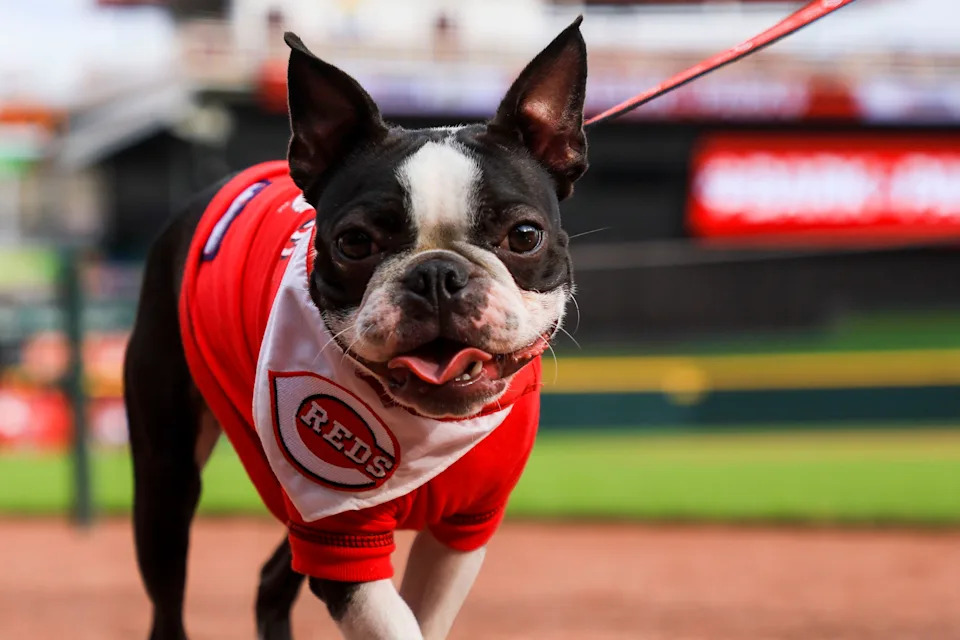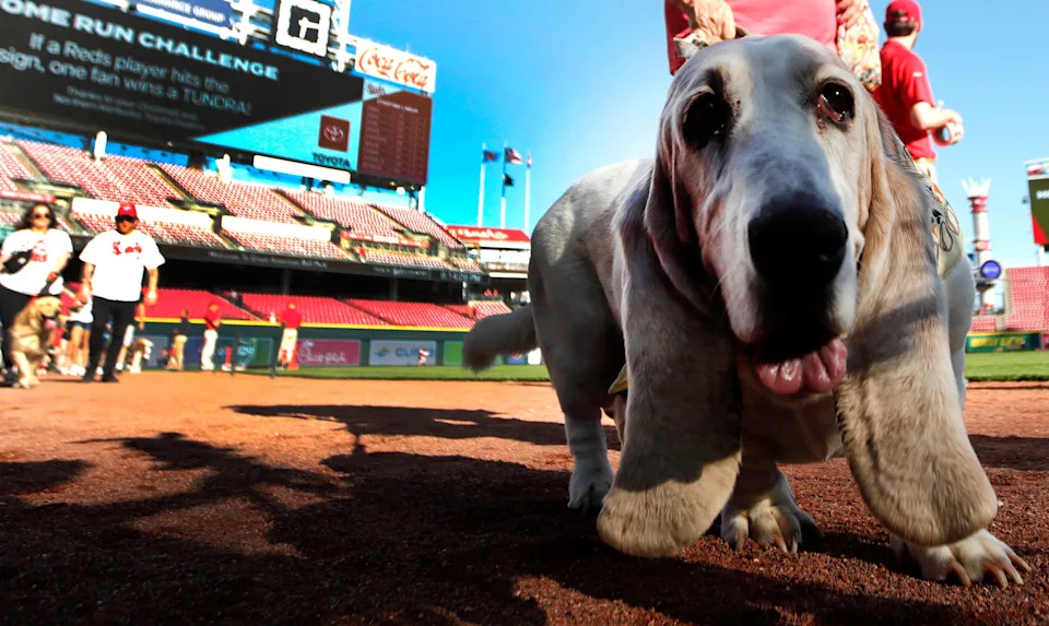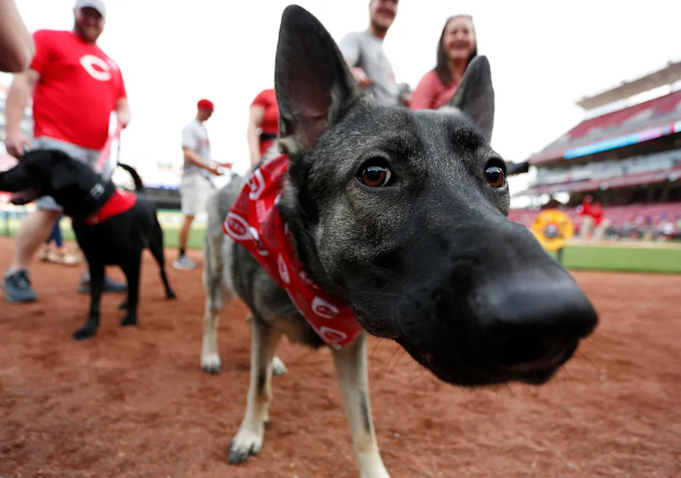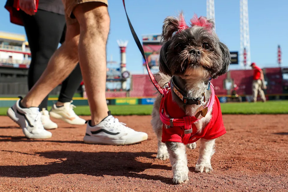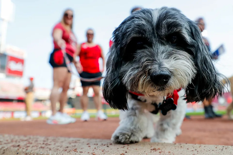 Aug. 12, 2024: Dogs walk on the warning track for Bark in the Park day before the game between the St. Louis Cardinals and Cincinnati Reds at Great American Ball Park.