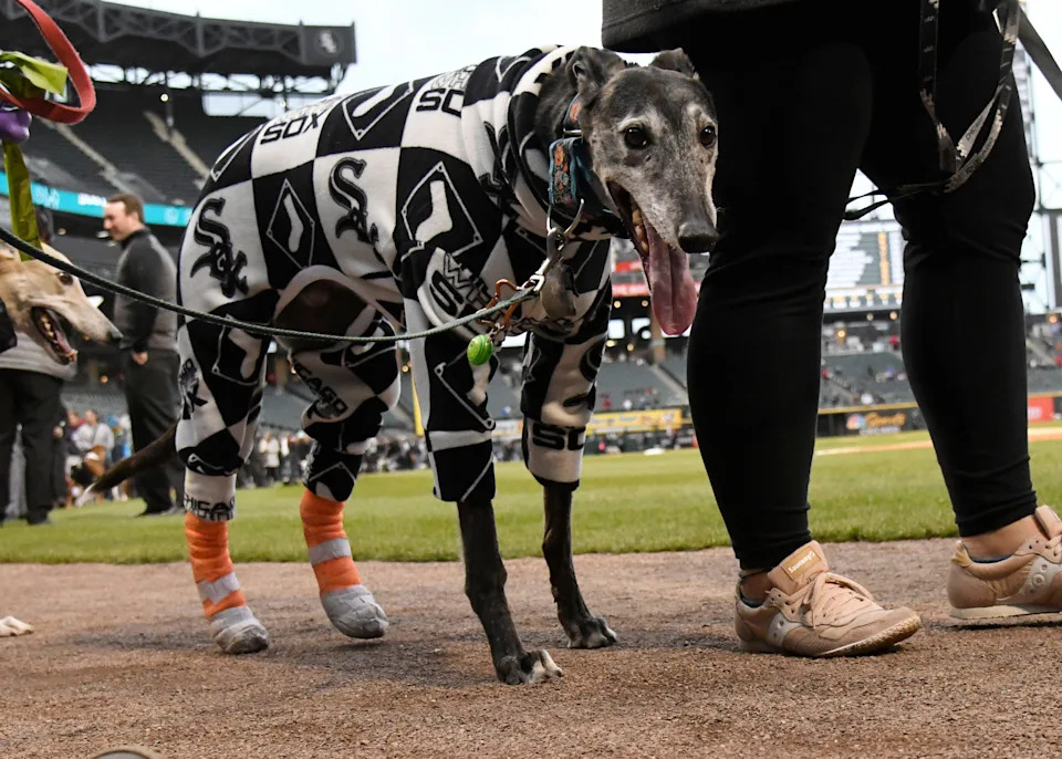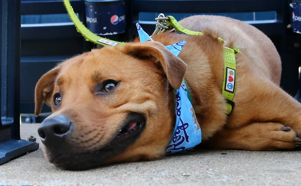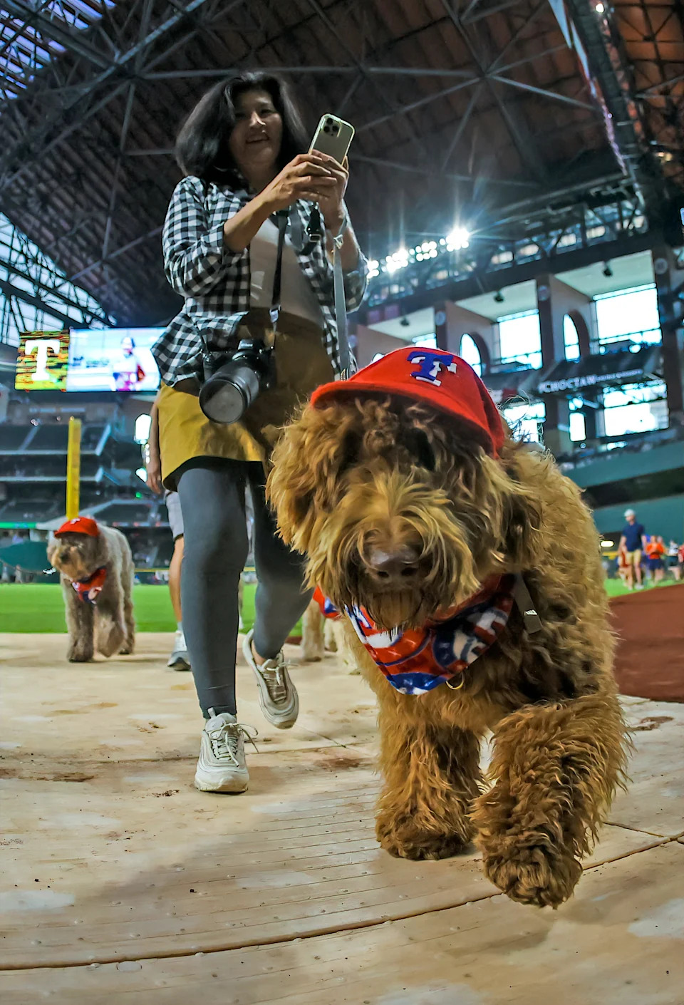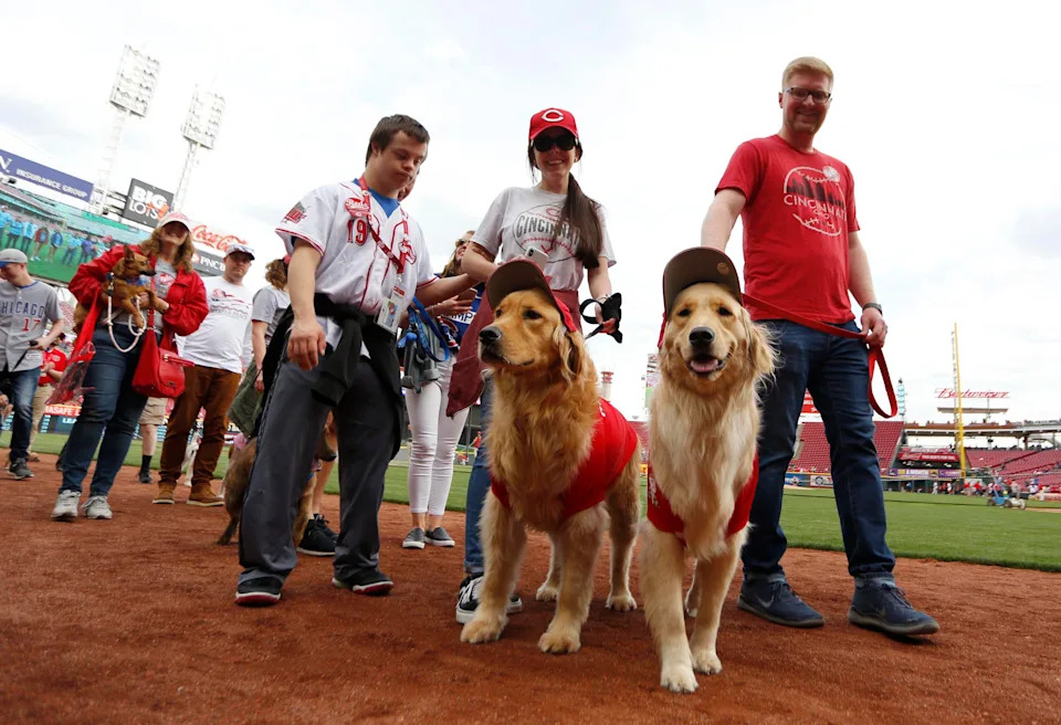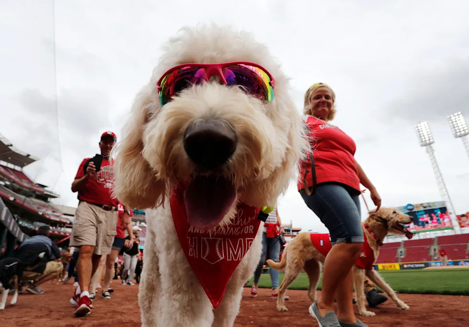 Aug. 12, 2024: Dogs walk on the warning track for Bark in the Park day before the game between the St. Louis Cardinals and Cincinnati Reds at Great American Ball Park.