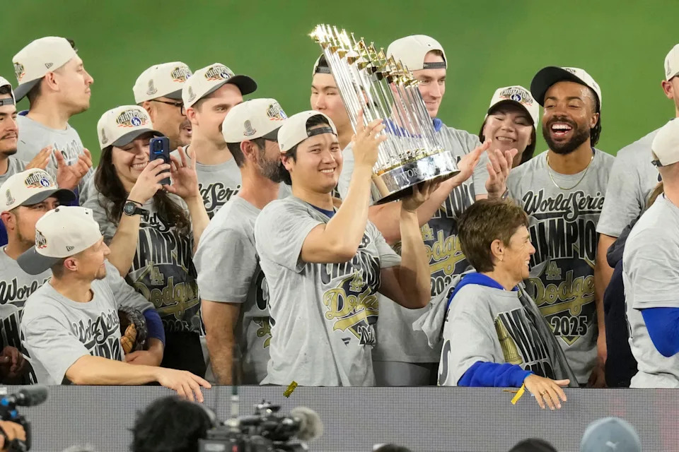 Shohei Ohtani (17) and center fielder Justin Dean (75) celebrate with teammates after the Los Angeles Dodgers defeated the Toronto Blue Jays in Game 7.