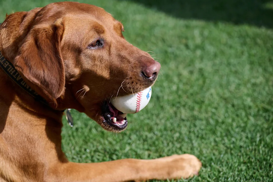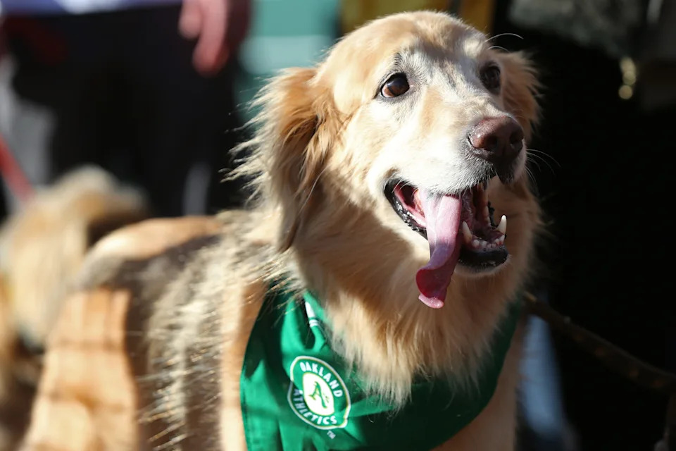 March 31, 2024: Oakland Athletics head groundskeeper Clay Wood’s dog Reba plays with a baseball on the field before the game between the Oakland Athletics and Cleveland Guardians at Oakland-Alameda County Coliseum.