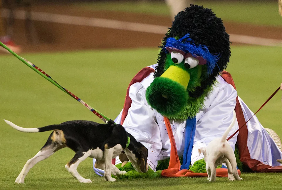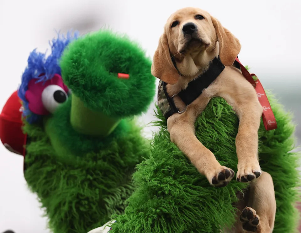 Aug. 6, 2025: The Phillie Phanatic interacts with Philadelphia Phillies service dog Tugger during a break in action against the Baltimore Orioles at Citizens Bank Park.