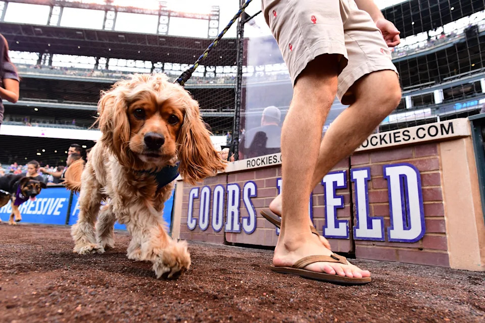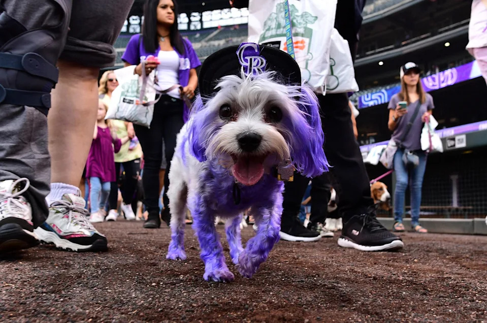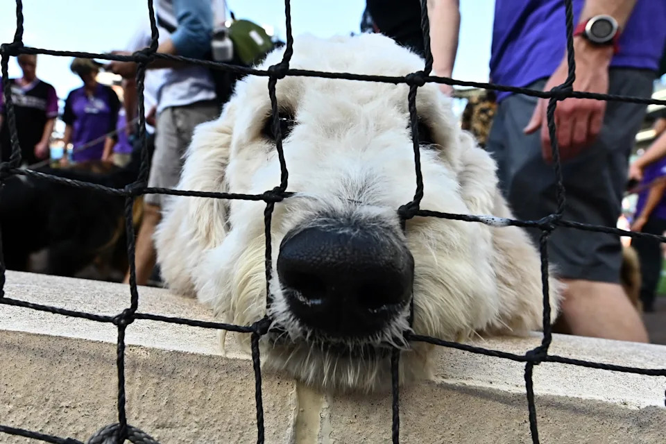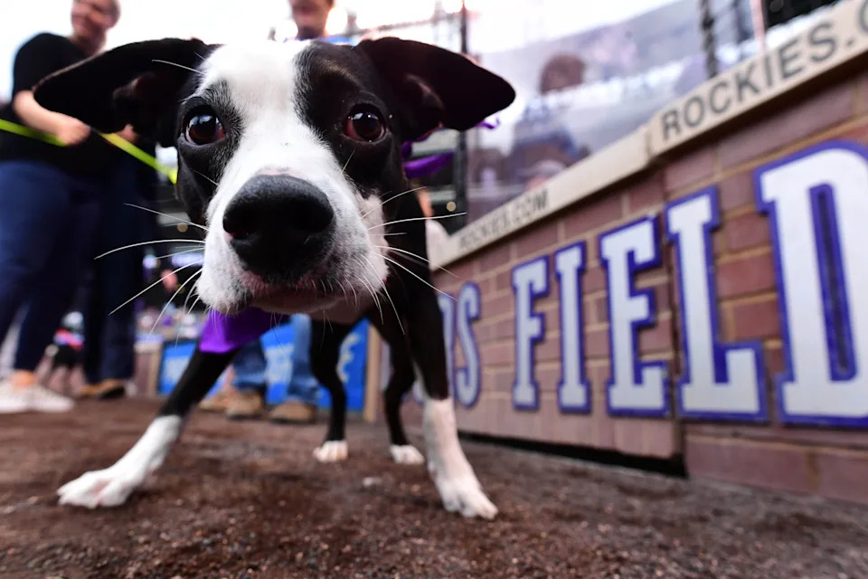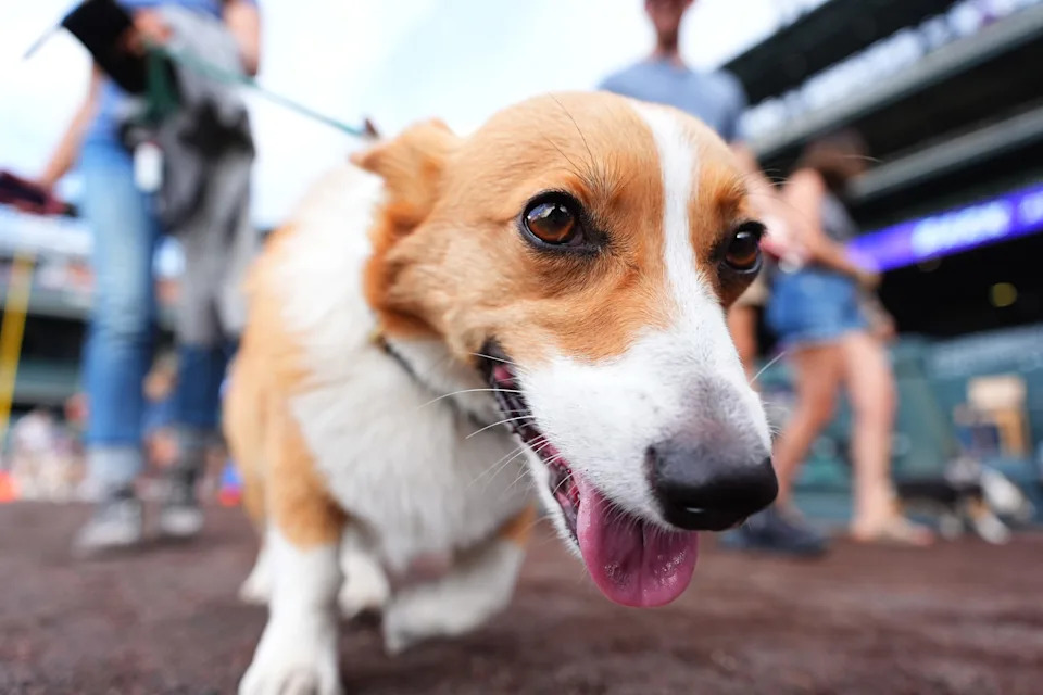 Aug. 28, 2024: A dog gets close to the camera during the Bark at the Park event before the Colorado Rockies’ game against the Miami Marlins at Coors Field.