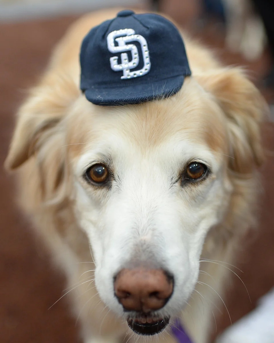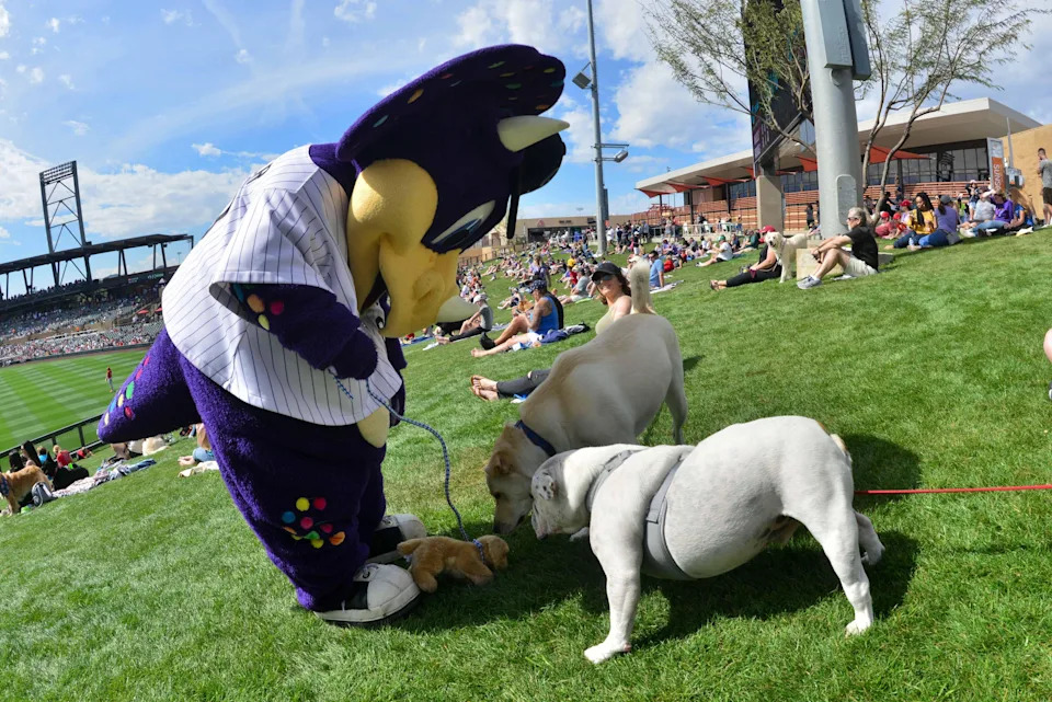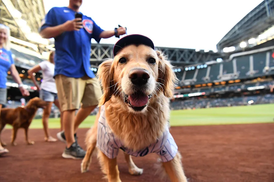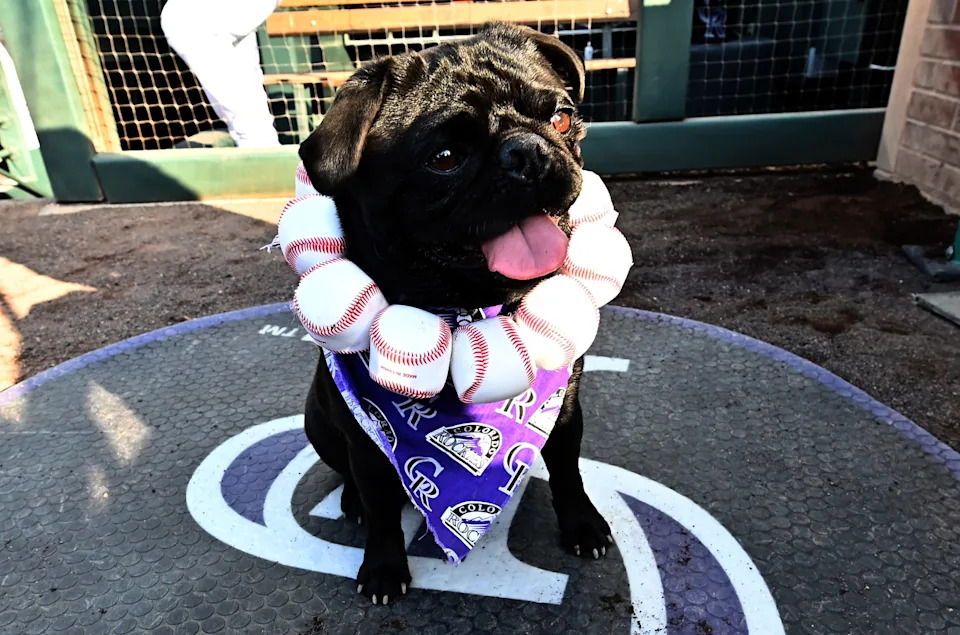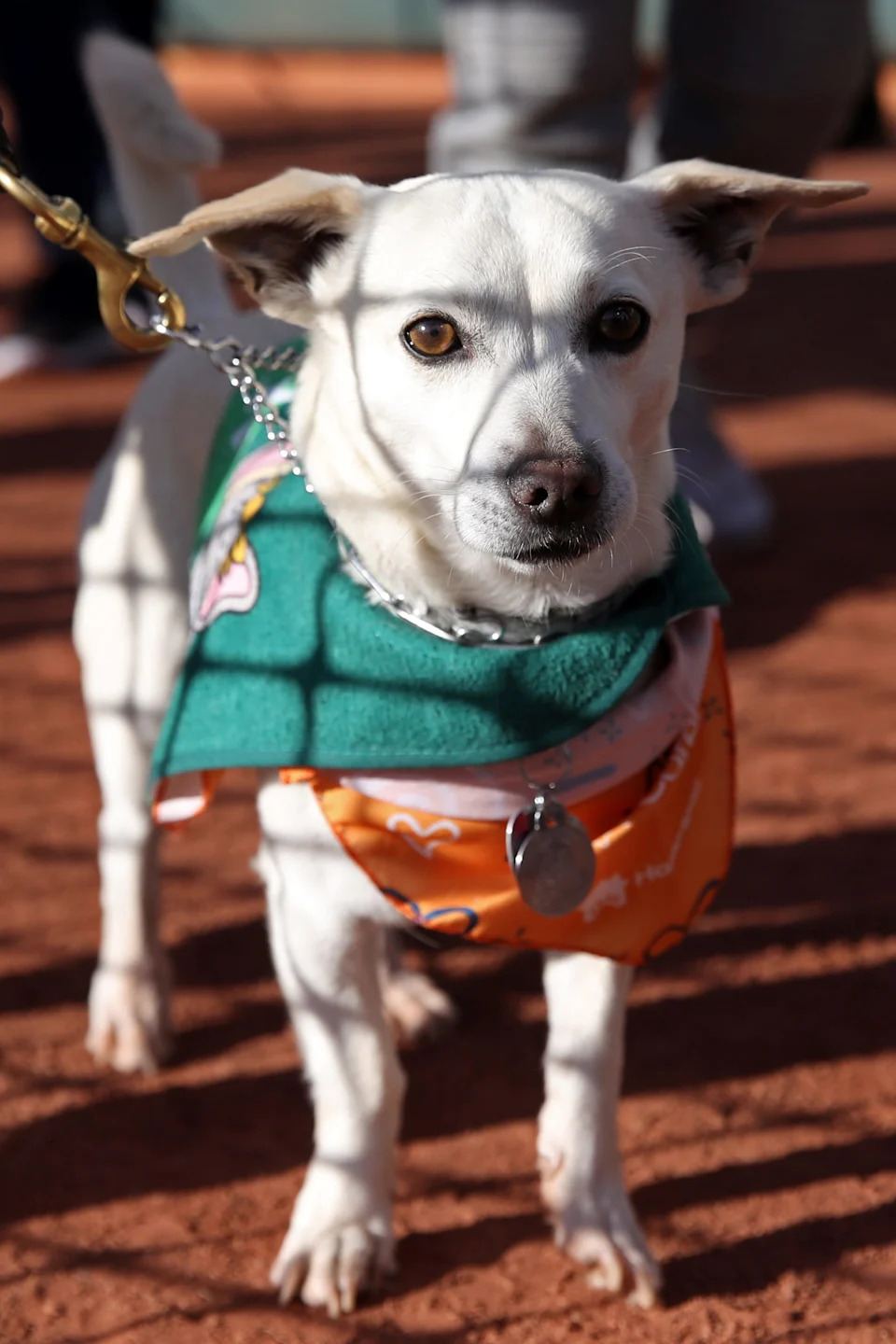 Aug. 28, 2024: A dog gets close to the camera during the Bark at the Park event before the Colorado Rockies’ game against the Miami Marlins at Coors Field.