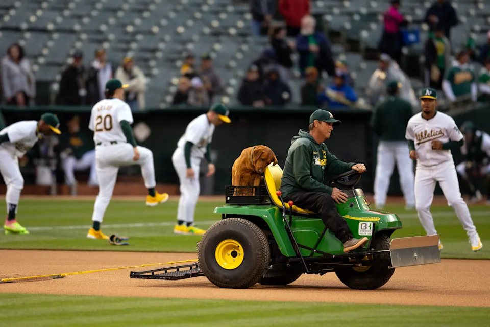 March 29, 2024: Oakland Athletics groundskeeper Clay Wood and his dog rake the infield before a game against the Cleveland Guardians at Oakland-Alameda County Coliseum.