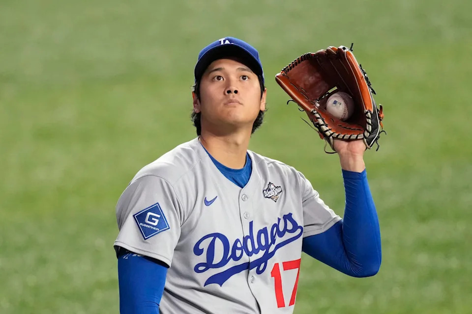 Shohei Ohtani (17) celebrates with the Commissioner’s Trophy after the Dodgers defeated the Toronto Blue Jays in Game 7.