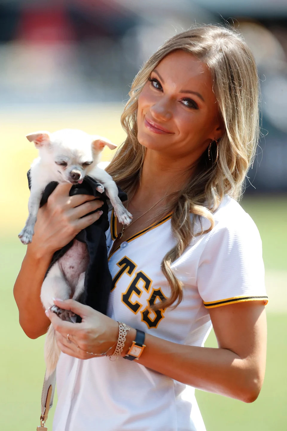 Aug. 28, 2024: Television actress Caitlin O’Connor holds her dog Bubbles on the field prior to the Pittsburgh Pirates playing the Chicago Cubs at PNC Park.