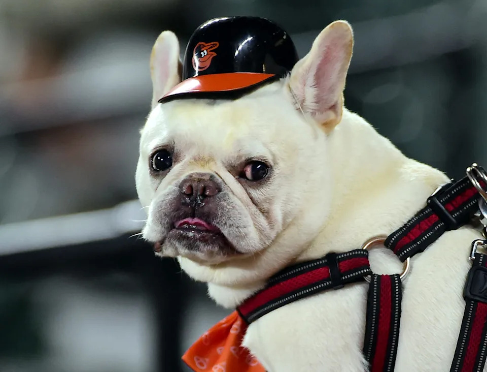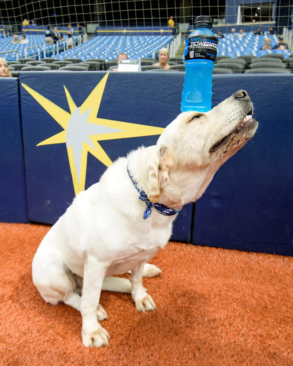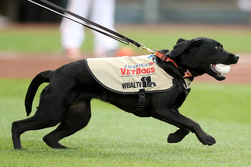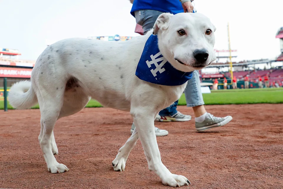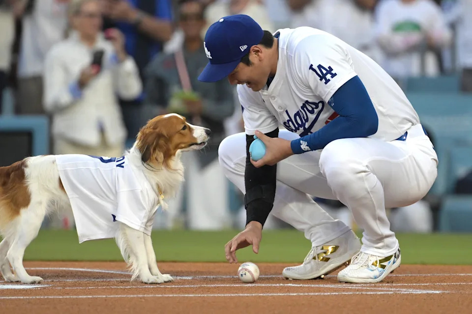 Aug. 28, 2024: Decoy, the dog of the Los Angeles Dodgers’ Shohei Ohtani, waits for instruction before delivering the first pitch before a game against the Baltimore Orioles at Dodger Stadium.