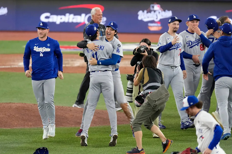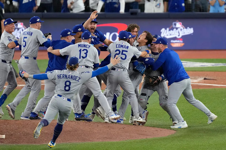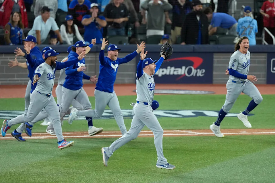 The Los Angeles Dodgers celebrate after defeating the Toronto Blue Jays in Game 7.