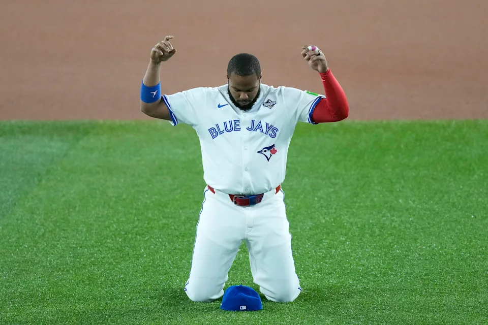 Toronto Blue Jays first baseman Vladimir Guerrero Jr. (27) prays before Game 7.