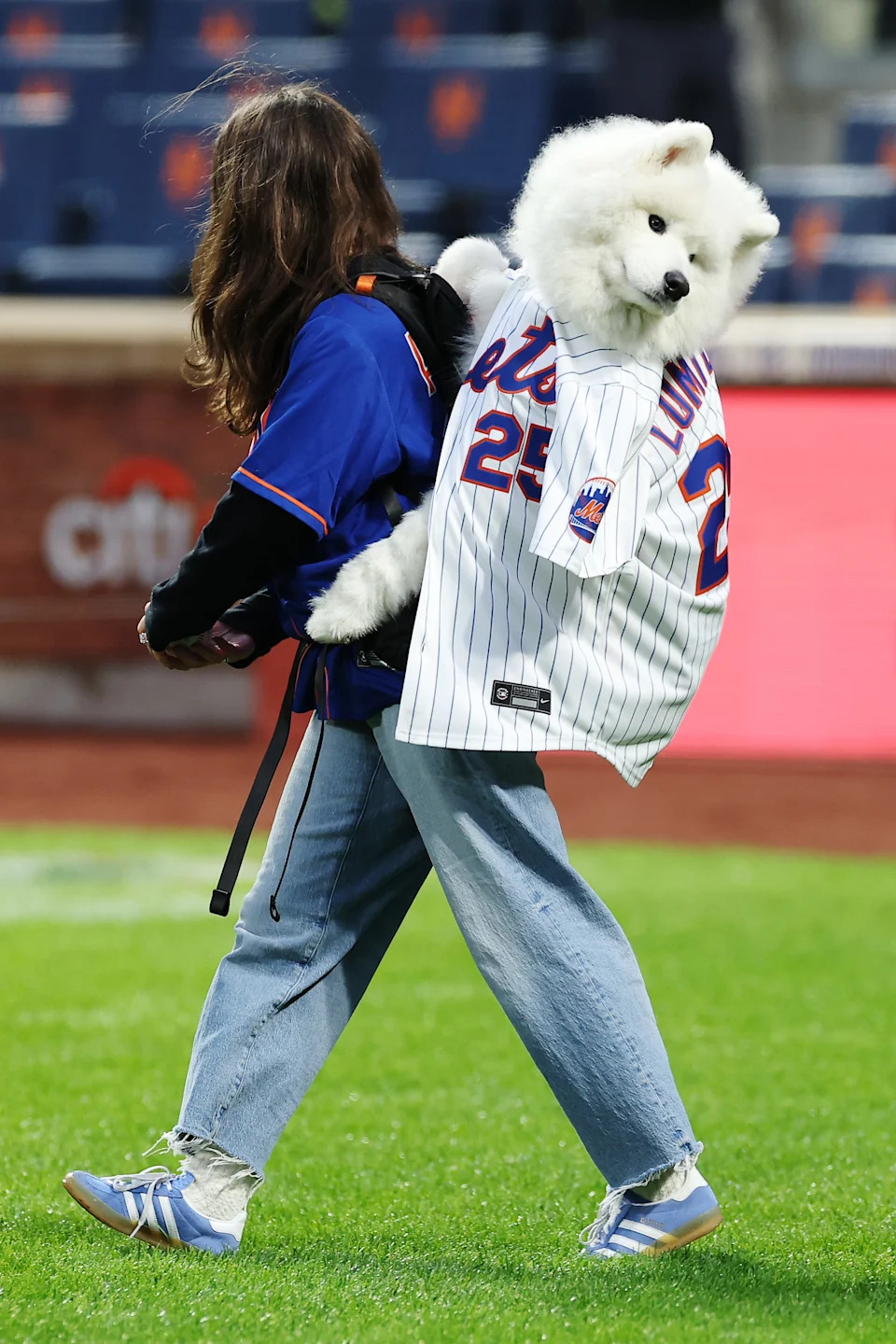 April 7, 2025: Jackie Hornung and her Samoyed dog, Lumi (also known as Little Bear Lumi), throw a ceremonial first pitch before the game between the New York Mets and Miami Marlins at Citi Field.