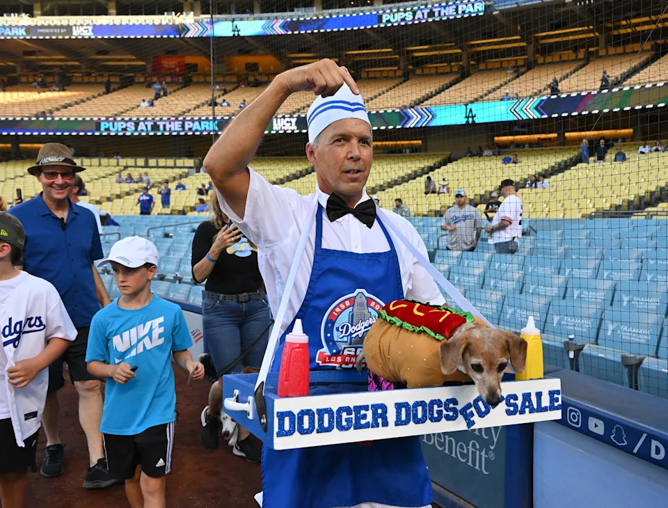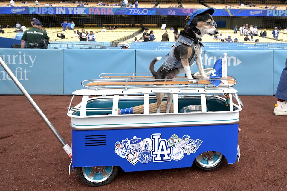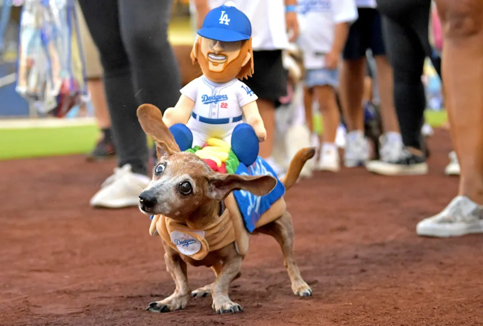 Sept. 5, 2022: A dachshund gives a Los Angeles Dodgers starting pitcher Clayton Kershaw doll a ride around the field during the Pups at the Park Parade at Dodger Stadium.