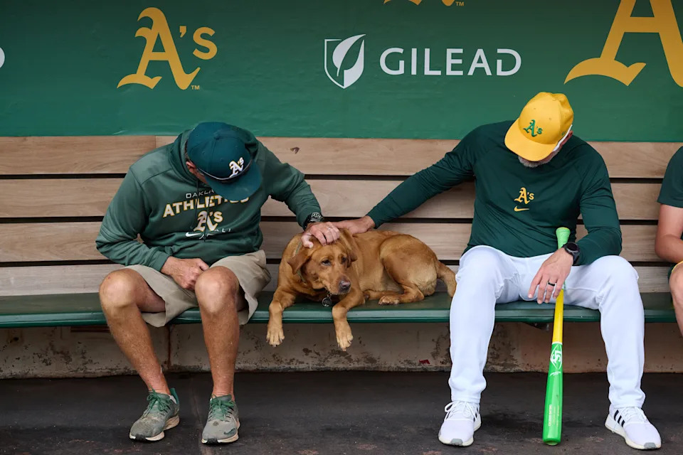 Aug. 24, 2024: Oakland Athletics head groundskeeper Clay Wood (left) and manager Mark Kotsay (right) pet Reba, the Oakland Athletics’ clubhouse dog, in the dugout before the game between the Oakland Athletics and Milwaukee Brewers at Oakland-Alameda County Coliseum.