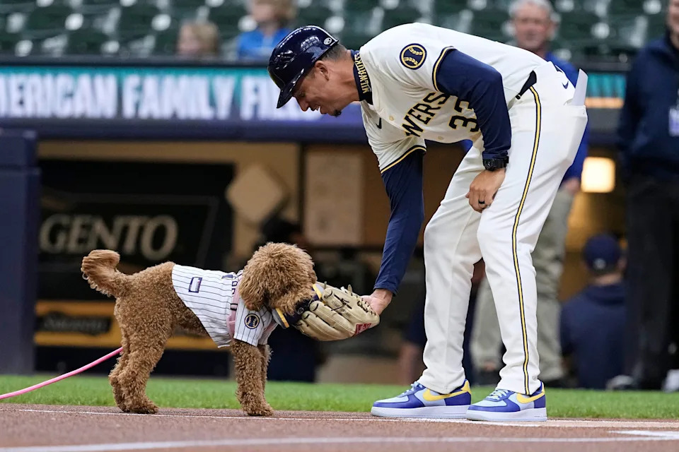 May 9, 2024: A dog takes the ball from Milwaukee Brewers first base coach Quintin Berry following a first pitch prior to the game against the St. Louis Cardinals on Bark at the Park night at American Family Field.