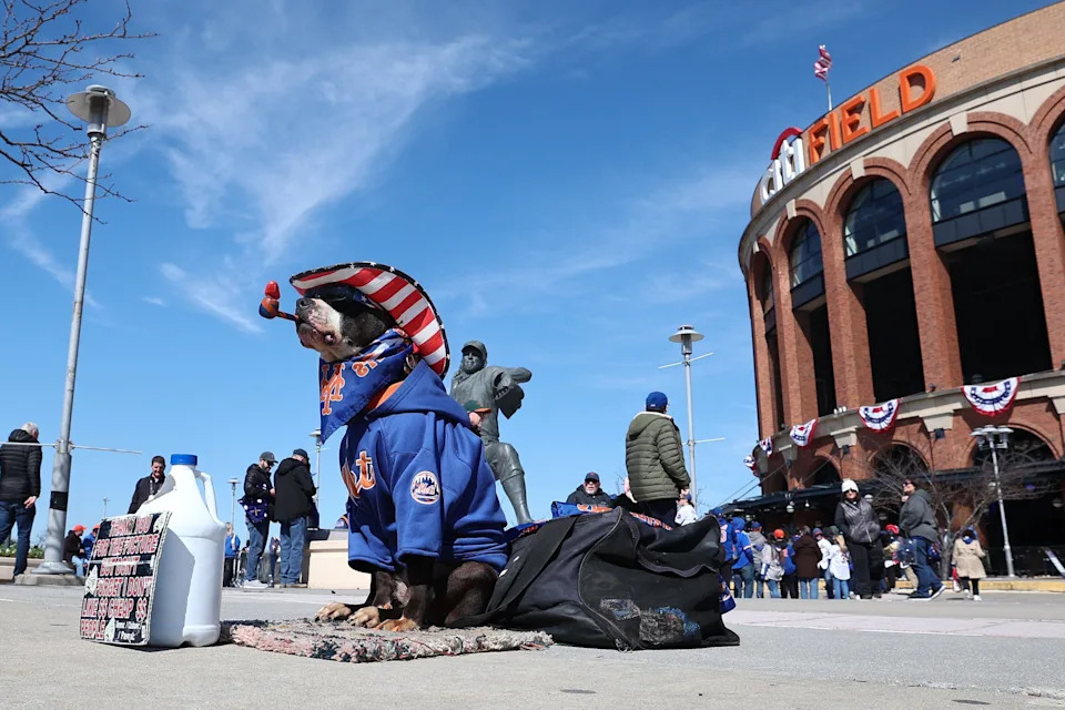 March 29, 2024: A dog dressed in New York Mets apparel sits in front of Citi Field before the Opening Day game between the Mets and Milwaukee Brewers.