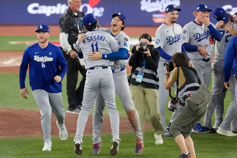 Los Angeles Dodgers pitcher Roki Sasaki (11) and Shohei Ohtani (17) celebrate after defeating the Toronto Blue Jays in Game 7.